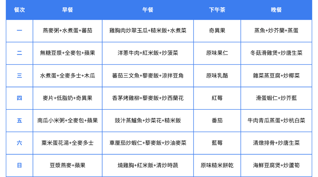 - 午餐建議: 遵循「211餐盤」(2份蔬菜、1份蛋白質、1份全穀物),如雞胸炒雜菜配糙米飯。