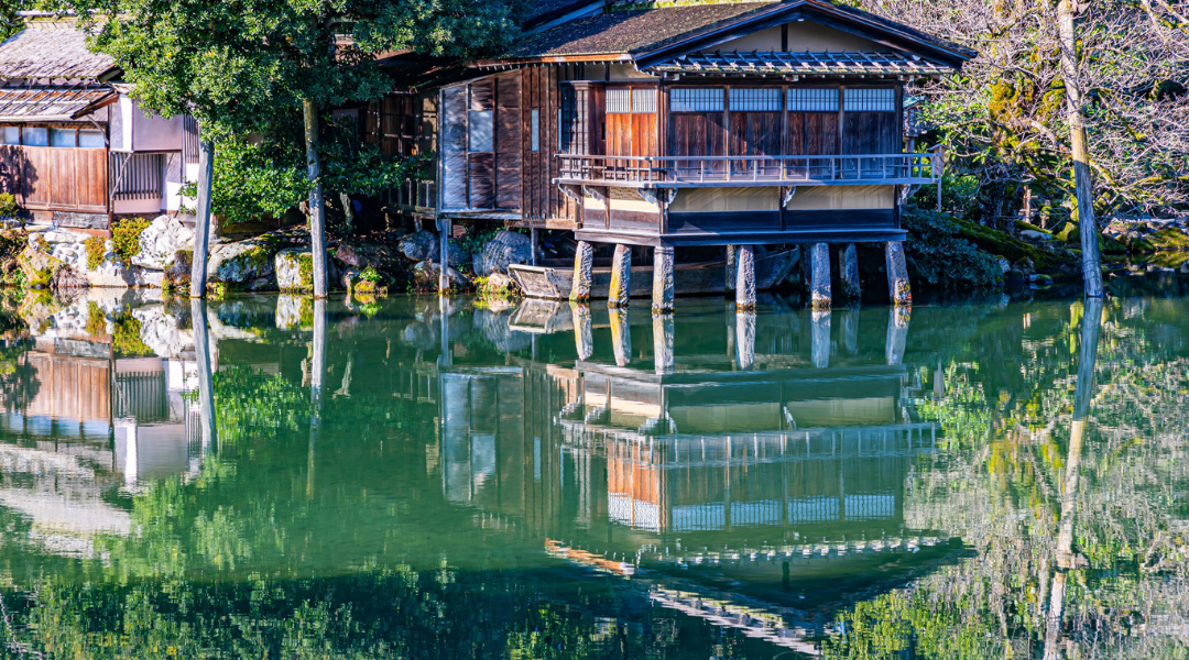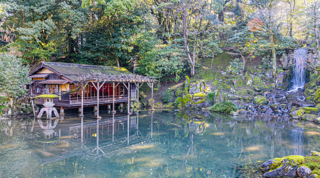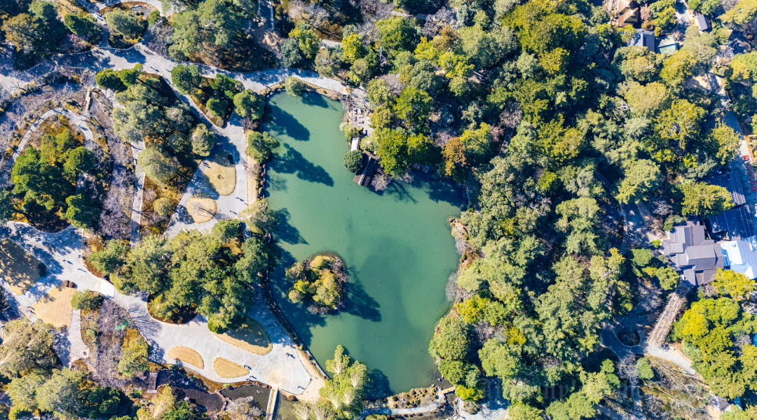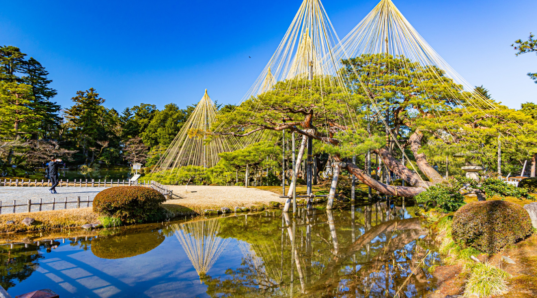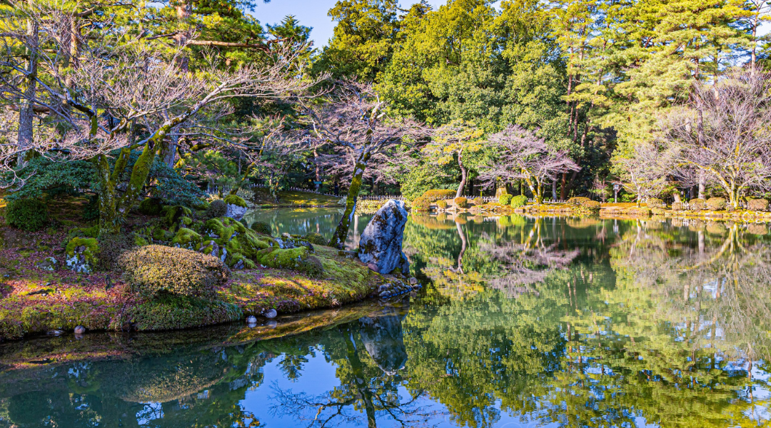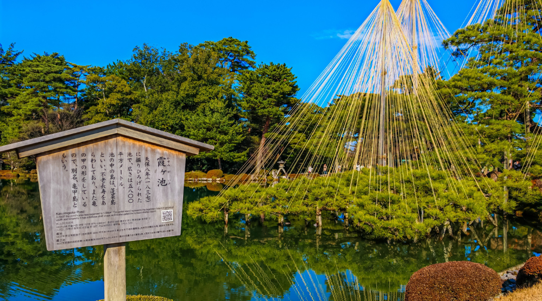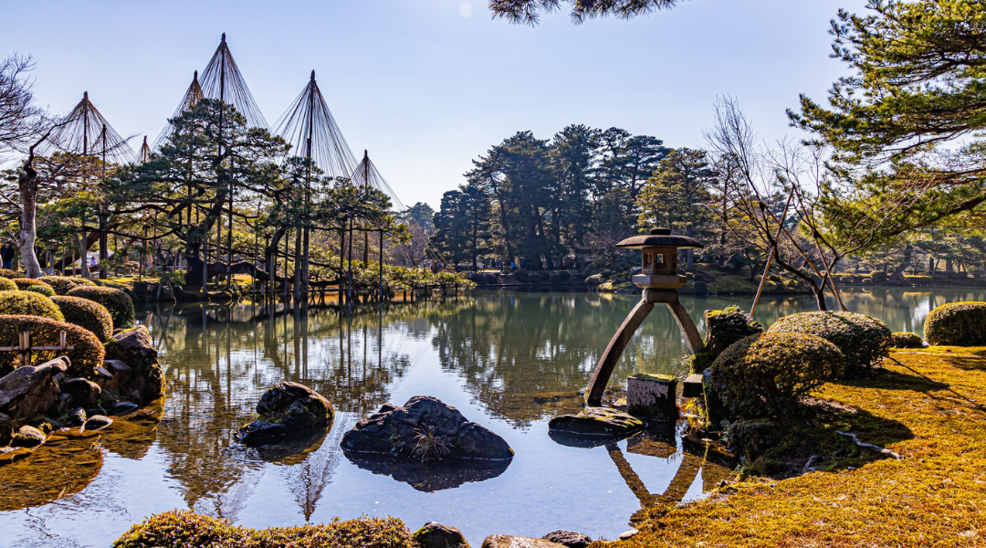 兼六園是江戶時代集成了當時各種先進造園手法而建成,建造時充分地利用土地在庭園中挖鑿大池塘堆砌假山,在適合的地點安排加插亭台與茶室,到訪者可欣然地穿梭其間以觀賞其的優雅。庭園中有數個池塘並以曲水相連,工仗更利用挖鑿池塘的泥土堆砌出假山作點綴,並且種植多種花草樹木襯托,使此庭園至臻完美。